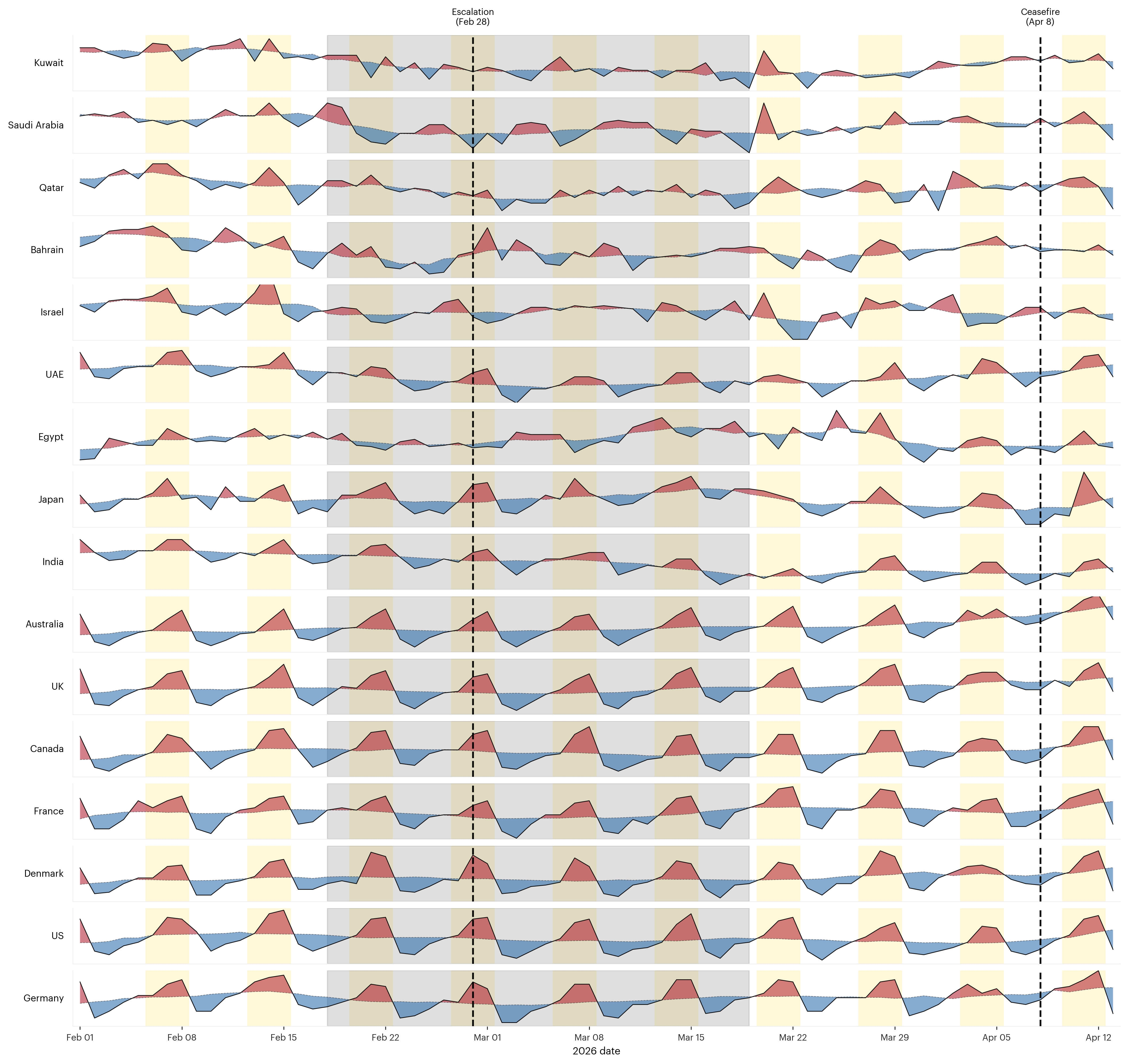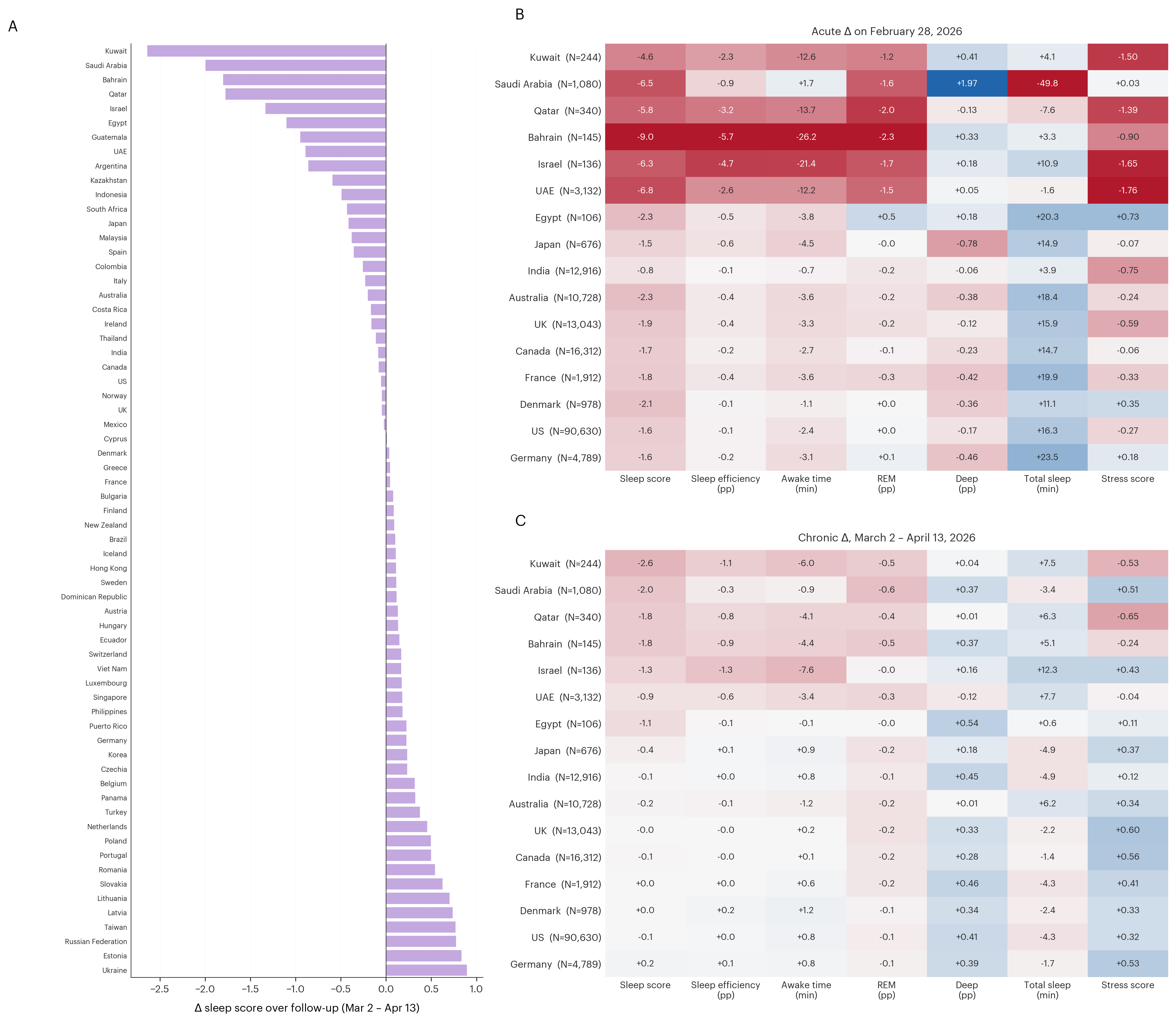 Methods: We analyzed 10.5 million user-nights from 197,989 Ultrahuman Ring users across 65 countries over a 72-day window (February 1 – April 13, 2026), quantifying the chronic effect across the 43-day post-escalation window (Mar 2 – Apr 13) against the Feb 1–27 baseline.