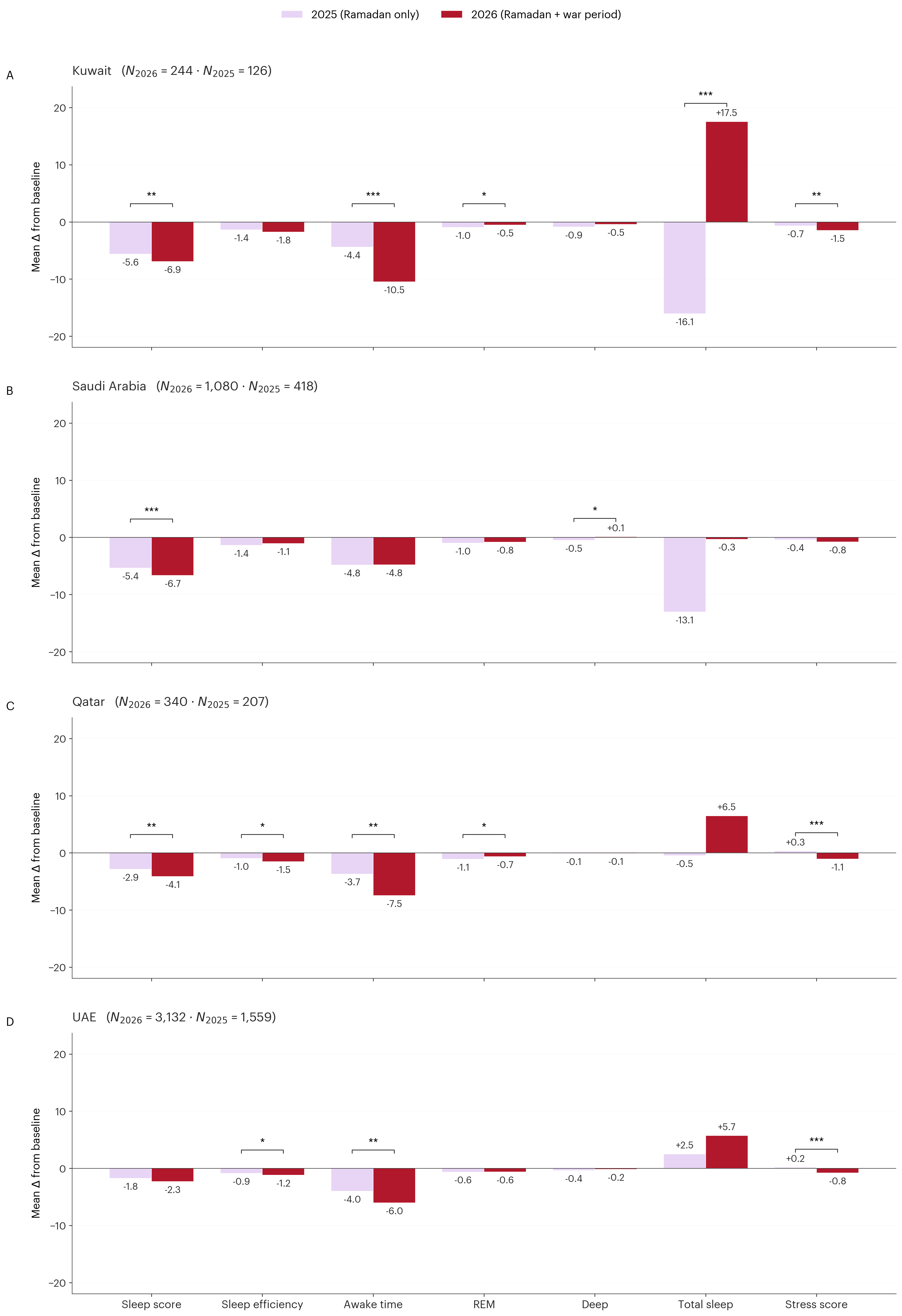 Across the four high-exposure countries with robust longitudinal samples in both years — Kuwait (N₂₀₂₆=244 · N₂₀₂₅=126), Saudi Arabia (1,080 · 418), Qatar (340 · 207), and the UAE (3,132 · 1,559) — the 30-day Ramadan 2026 sleep changes consistently exceeded those during the 2025 Ramadan period (Figure 2).
