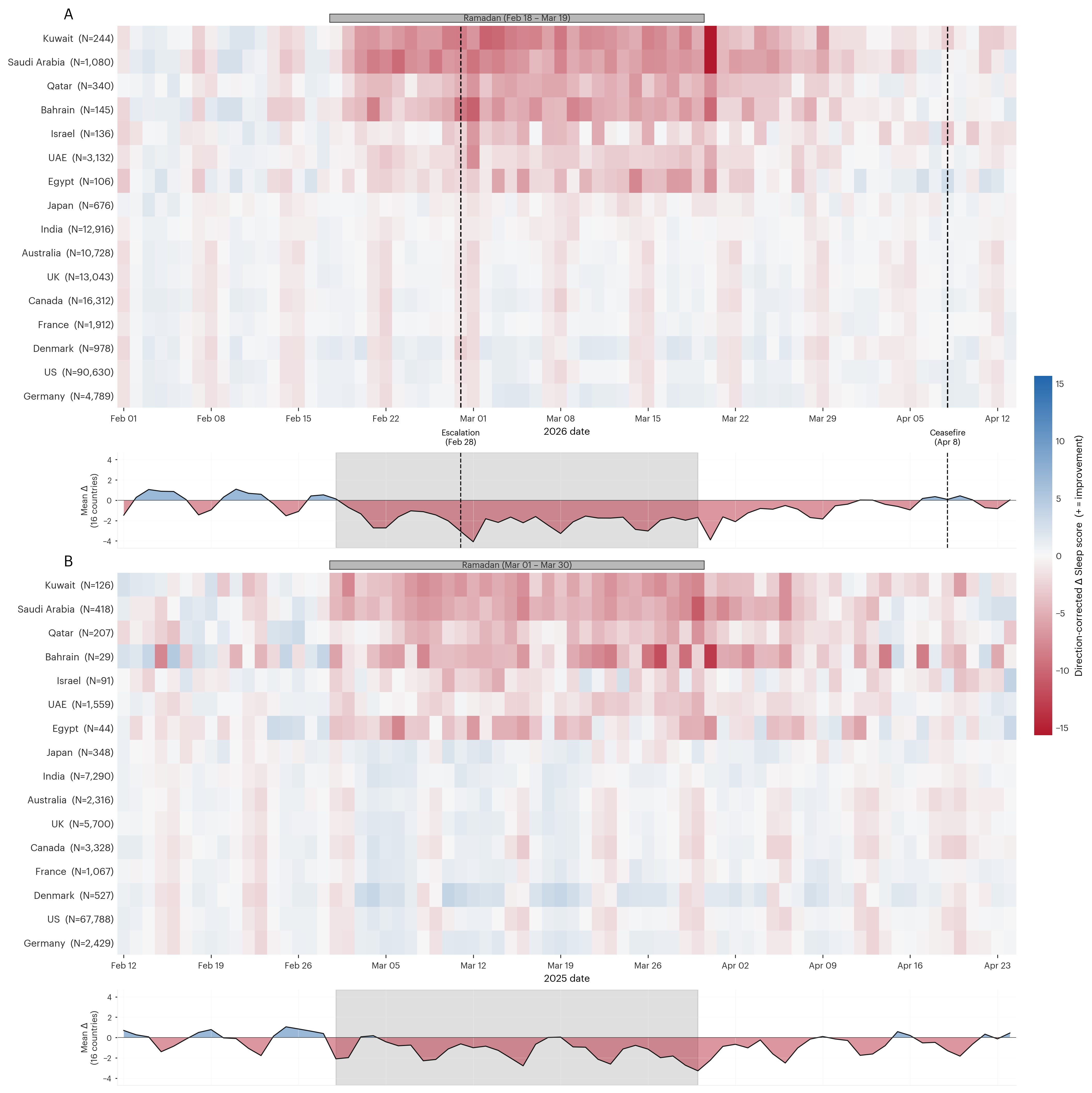 The phase-aligned 2025-vs-2026 sleep-score trajectories place the two years side by side, with each year's Ramadan start as the alignment anchor (Figure 3). The 2025 panel shows the sleep-score shift that accompanies Ramadan, visible here as a red band during and immediately after the 30-day fasting period. The 2026 panel reproduces that Ramadan-period shift and layers on a sharp additional downward inflection following the February 28 escalation. A diff-in-diff test over the 10 days before and after the escalation within each year confirms that the Feb 28 inflection is specific to 2026: the 2026 aggregate drops 0.69 pts across the Feb 28 transition, whereas 2025 moves only 0.05 pts across the matched March 11 transition (t = −1.99, p = 0.031). The 2026 red band holds through mid-April with only gradual fading, with per-country heterogeneity: Kuwait, Saudi Arabia, and Qatar remain visibly red through April 13, while Bahrain, Israel, and the UAE fade earlier.