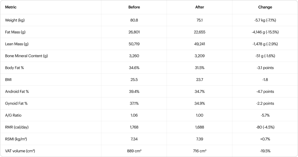 Android fat decreased by 4.7 points (39.4% to 34.7%), trunk by 4.2 points, gynoid by 2.2 points, and limbs by 2.0-2.3 points (uniform). The A/G ratio improved from 1.06 to 1.00 (target: <0.95). CoreScan-measured visceral adipose tissue declined from 889 to 716 cm³ (-19.5%), with subcutaneous adipose tissue declining proportionally (1,719 to 1,376 cm³, -20.0%). Android fat reduction represents the most clinically significant regional change, as it directly reflects the visceral depot driving the insulin-resistant phenotype.