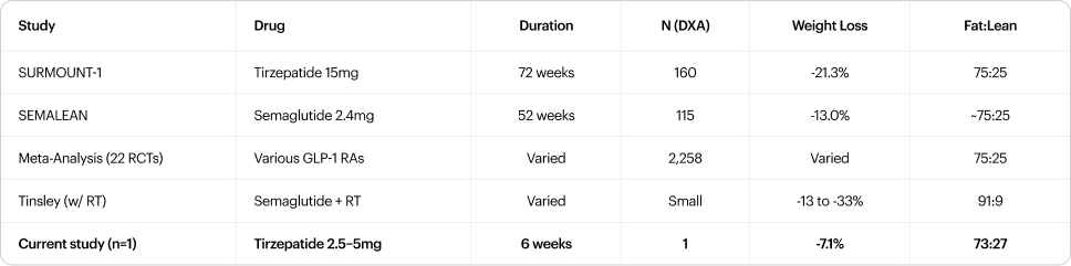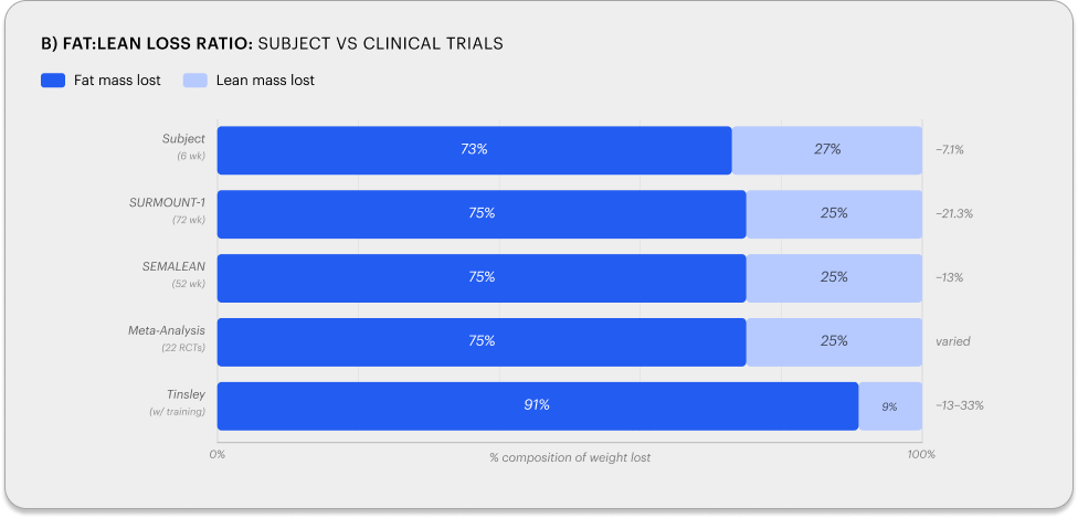 Pre-drug and on-drug Ring AIR metrics were compared as period means (92 days vs 42 days). Blood markers were compared as absolute and percentage changes between two time points. DEXA body composition changes were calculated as absolute mass changes and percentage contributions to total weight loss. Weight loss composition was benchmarked against DEXA-verified clinical trial data from SURMOUNT-1 (n=160),[2] SEMALEAN (n=115),[4] a meta-analysis of 22 RCTs (n=2,258),[5] and a resistance training case series[7].